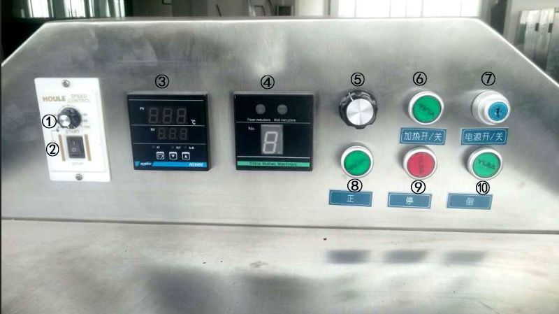 电磁炒货机操作流程 电磁炒货机是一种电磁感应加热、智能自动控制的炒货设备。它与家用电磁炉工作原理相接近。 具有高效节能、绿色环保、智能控制、操作简便、合理耐用五大特点。 许多客户在刚买到设备时,看到操作面板上的各种开关按纽,不免会有些不知所措。 上一篇我们重点介绍了各种开关按纽的作用,下面我们还以许昌智工生产的DCCZ5-5电磁炒货机为例重点介绍一下操作流程: 我们先来看一下DCCZ5-5的操作面板图片: 那么,这些开关按纽的操作流程是什么呢? 一、打开设备电源:顺时针扭动图片上“⑦电源开/关(正面蓝色)”的钥匙,使锁孔由垂直到水平位置,此时炒货机处于通电待机状态。 二、设置需求温度:先按一下图片上“③温控器(正面黑色)”左下角的键,接着按向上向下键对数值进行增加或减少,设置好后,再按一下左下角的键确认并退出设置。(注:可根据炒制品特性,适当调整。) 三、调节加热档位:调节图片上“⑤加热档位调节旋钮(正面白色)”,顺时针调节加大档位,逆时针调节减小档位。并观察图片上“④加热档位显示器(正面黑色)”上显示的档位,显示“一”时不加热,档位越高,功率越大。(注:可根据炒制品特性,适当调整。) 四、打开调速开关:按下图片上“②调速器开关(正面黑色)”的上端,调速器通电,指示灯亮。 五、调节炒锅转速:调节图片上“①调速器旋钮(正面白色)”,顺时针调节加速,逆时针调节减速。(注:可根据炒制品特性,适当调整。) 六、按下正转按钮:按下图片上“⑧正(正面绿色)”按钮:指示灯亮,炒锅顺时针转动。此时可以上料开始炒货。 七、按下加热开/关按钮:按下图片上⑥加热开/关(正面绿色)按钮:指示灯亮,开始加热。炒货前一般需要预加热。 八、按下”停”止按钮:按下图片上“⑨停(正面红色)”按钮:指示灯亮,炒锅停止转动。出货前,应先按下此按钮。 九、按下“倒”转按钮:按下图片上“⑩倒(正面绿色)”按钮:指示灯亮,炒锅逆时针转动,此时可自动出料,炒货结束。